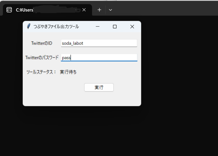 4. TwitterのID、TwitterのPWを入力し「実行」ボタンを押下ください ※2