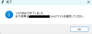 5. 実行終了すると「つぶやき出力終了しました。」のウインドウが表示されます